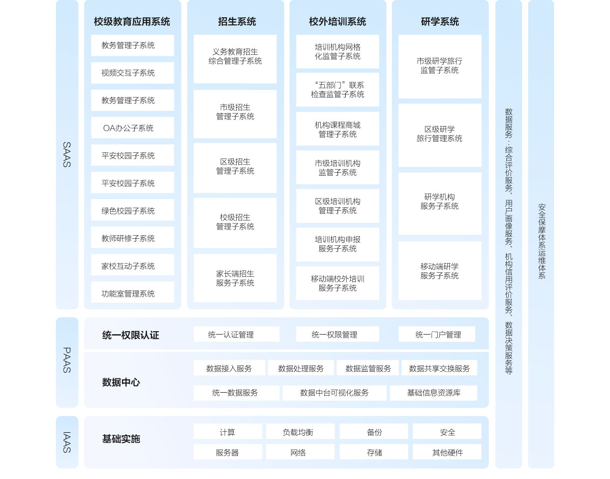 統(tǒng)一身份認(rèn)證、權(quán)管理,構(gòu)建統(tǒng)一的用戶體系、數(shù)據(jù)體系和應(yīng)用體系,面向區(qū)域教育管理者、教師、學(xué)生、家長、第三方等用戶提供一站式便捷服務(wù)。